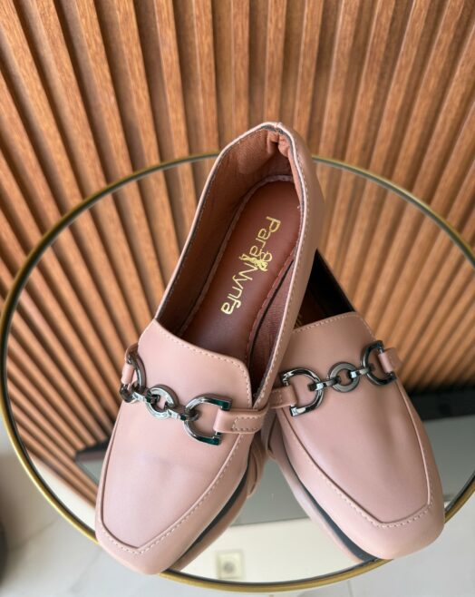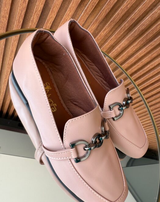Mocassim Bico Quadrado Detalhe Corrente Nude