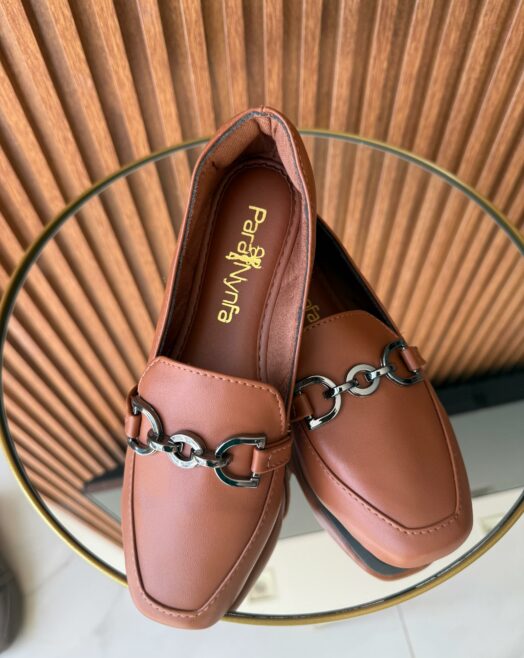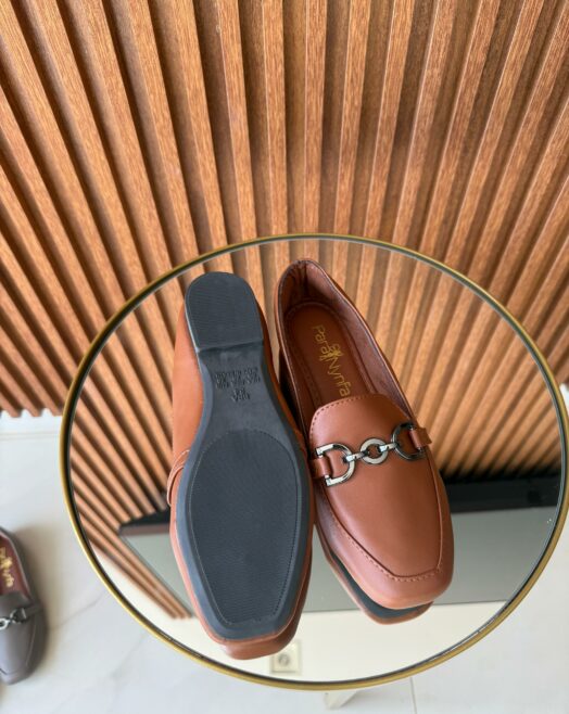 Mocassim Bico Quadrado Detalhe Corrente Caramelo